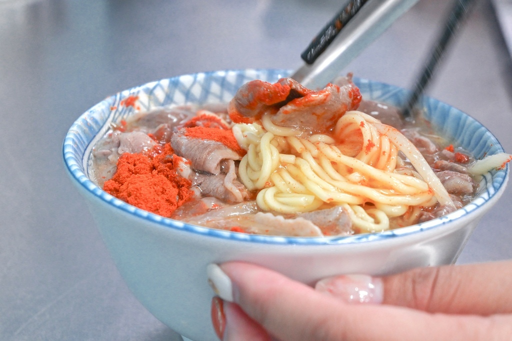 辣椒粉打翻了啦!每個人都是一大瓢一大瓢,一定要將焿湯弄得紅紅火火的,才是路境隨俗正港的吃法,很合理!
