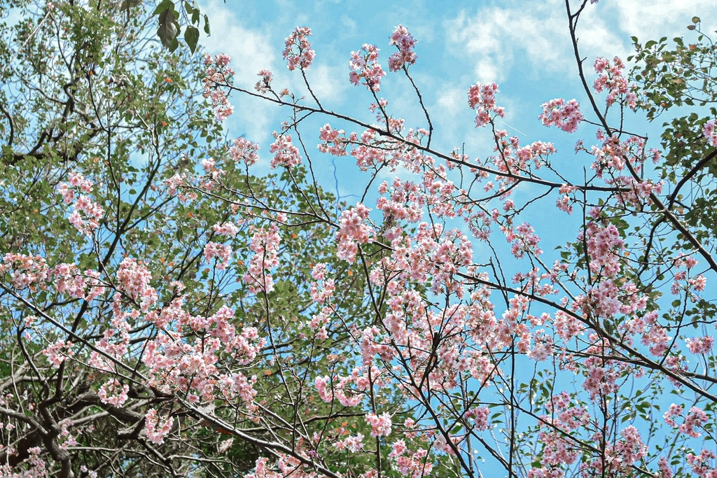 〈內湖碧山巖〉的櫻花屬於椿寒櫻品種,抬頭一望櫻花枝芽與交錯的綠意綻出最春日的柔美。