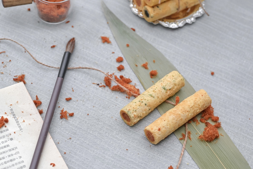 海苔肉鬆蛋捲的餅皮加入日本進口海苔粉、內餡是黃金豬後腿肉鬆,一層一層酥鬆鹹香的口感在嘴中,比原味肉鬆更多了淡淡海苔香氣,更有風味。