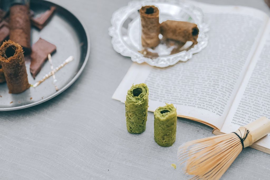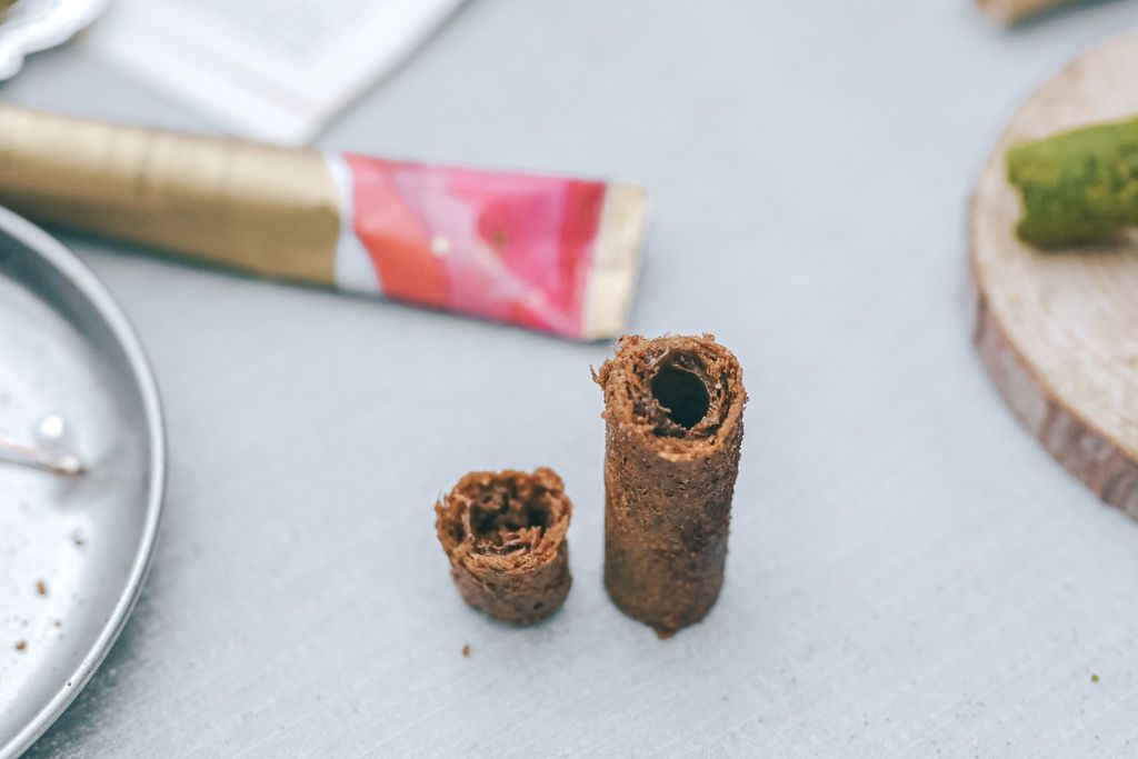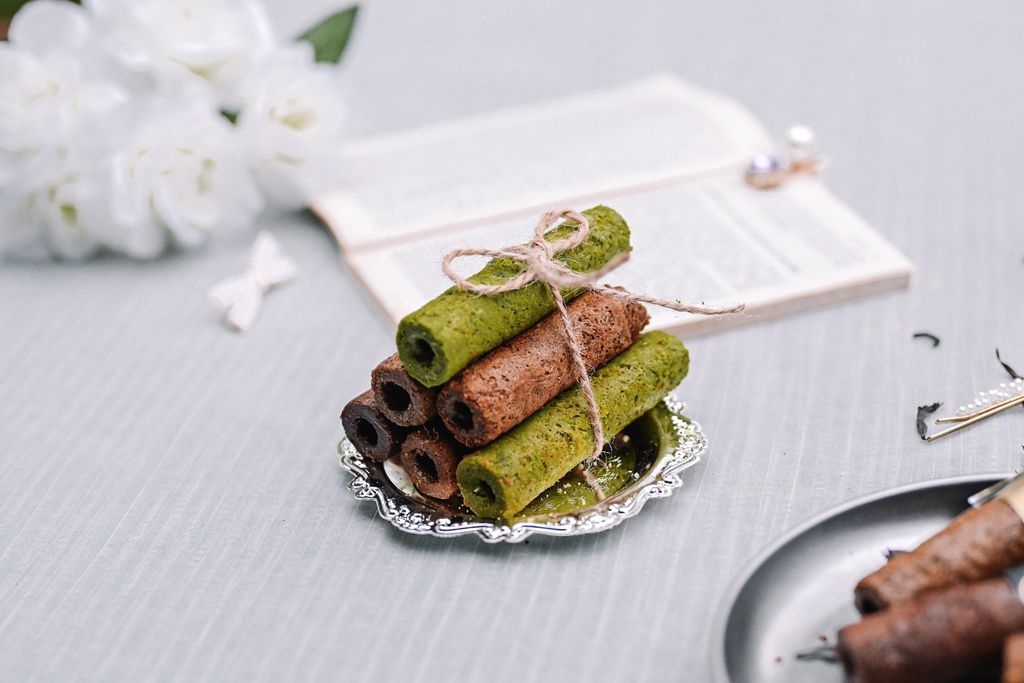 側面就可以看到每根蛋捲都非常厚實,陣陣茶香瀰漫於空氣之中,似聞了一壺剛泡好的茶,耐人尋味,如入林中亦或是山巒疊翠的一抹幽綠那樣清新。