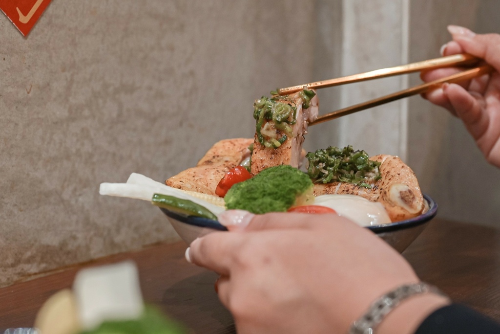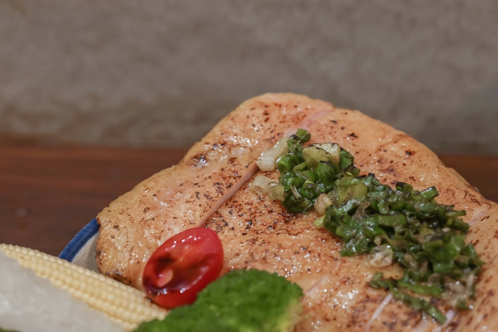 雞腿肉經過舒肥處理,口感細緻香滑好軟嫩,入口還可以感受到經過炙燒後雞皮的香氣、還有蔥鹽的香氣,一口吃下超級滿足,相信我點這就對了,我們倆都好喜歡、好喜歡。