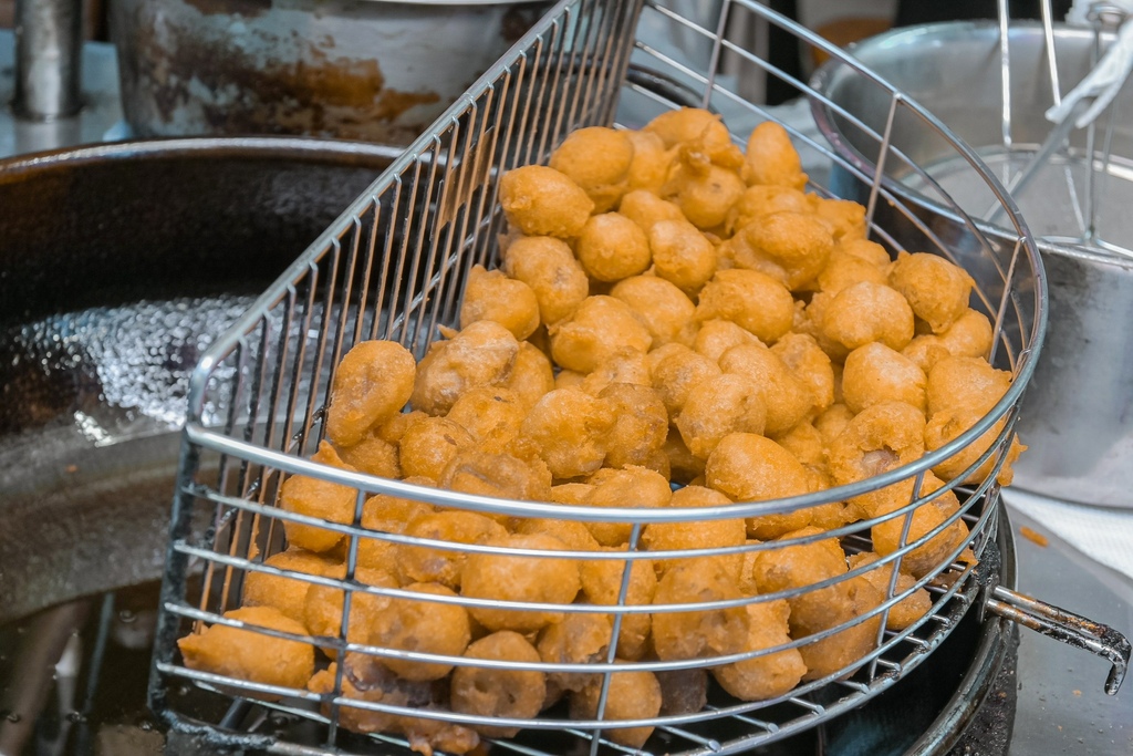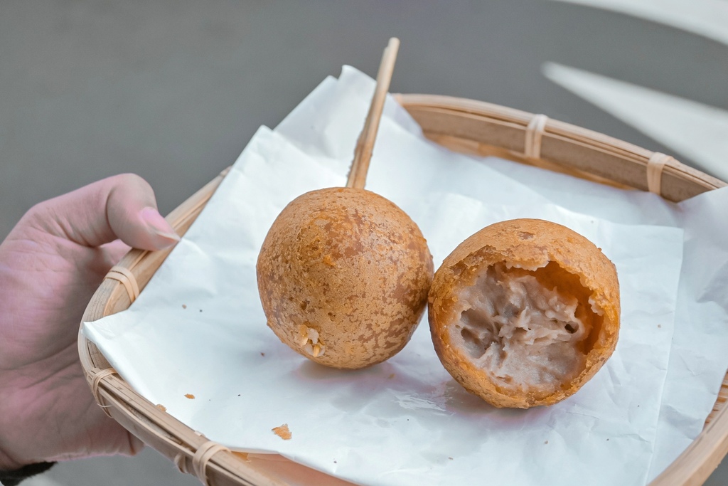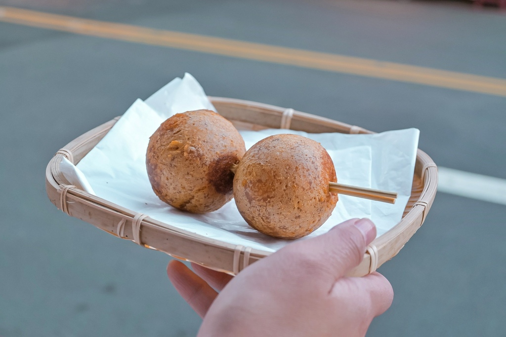 兩顆疊在一起就像巨大串丸子,外皮炸得酥酥脆脆,皮很薄不會很厚重,