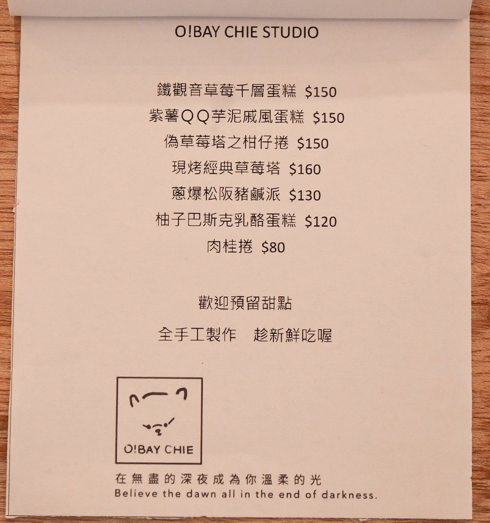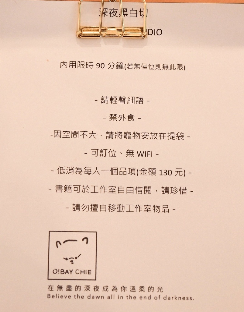 「深夜黑白切」是一間很溫暖的小店充滿著故事,2021年春節後成立工作室,只營業六日,甜點都是新鮮組裝或加熱烘烤,想要呈上一份熱騰騰如同深夜食堂能撫慰心靈的美食,這次來和之前消費方式不同,低消130元提供熱茶水,熱茶水都是茶農提供每日隨機,我也好喜歡主理人在菜單寫的這段話「在無盡的深夜成為你溫柔的光」