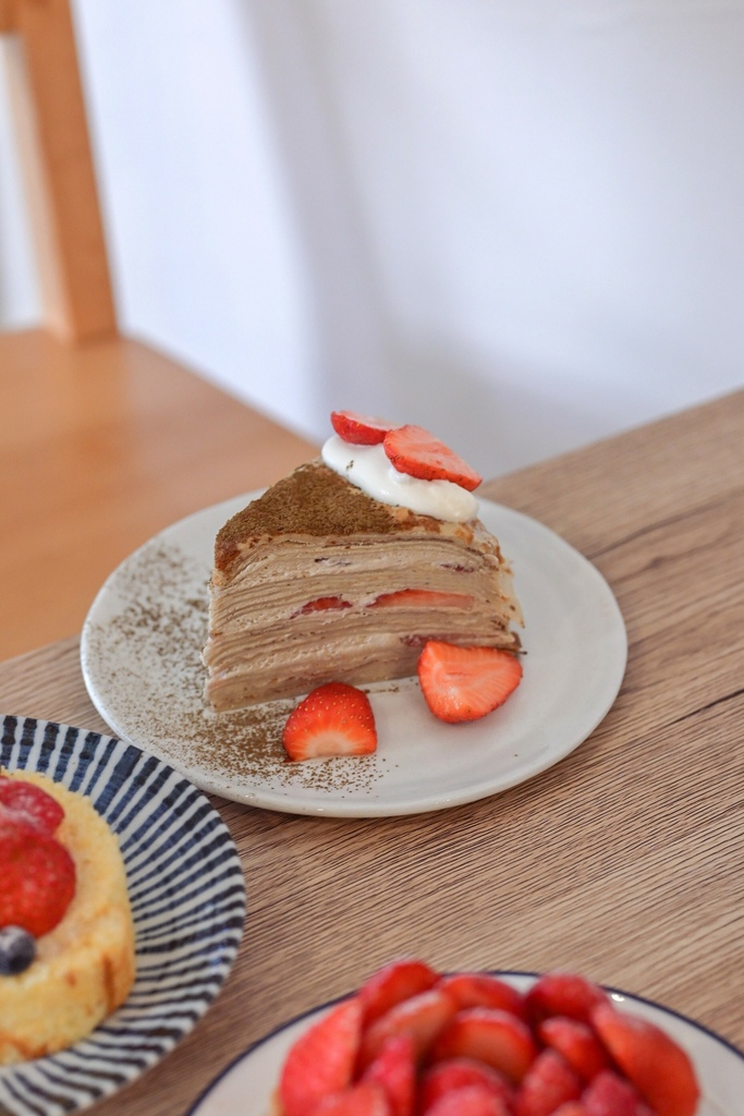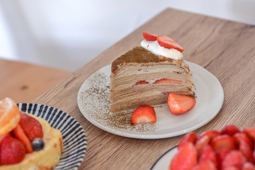 冰冰涼涼的千層蛋糕,側面看是一層蛋皮一層奶油堆疊而成,中間還有不少的草莓,草莓比例不高用於襯托點綴鐵觀音,鐵觀音茶味清爽不澀,以奶油滑順柔和的推進,草莓的酸甜不會搶了鐵觀音的香氣,反而很有層次。