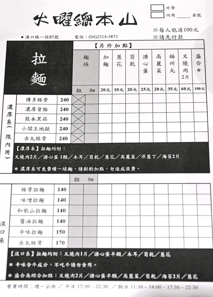 火曜總本山拉麵菜單