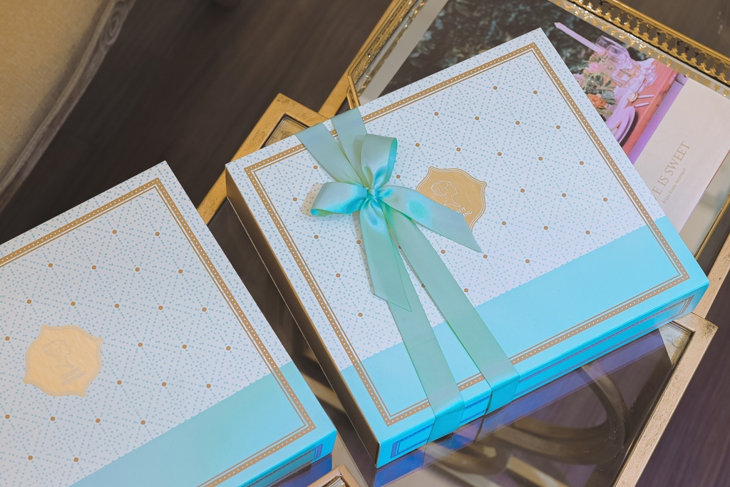 喜餅禮盒有兩色可以選擇,像是充滿夢幻感的粉紅色或是典雅的湖水藍色可選擇,依照預算和需求,選擇想要的盒裝,禮盒的有分中、大、特大(特大僅限湖水綠)這幾款可以選擇,都會附上可愛的緞帶。