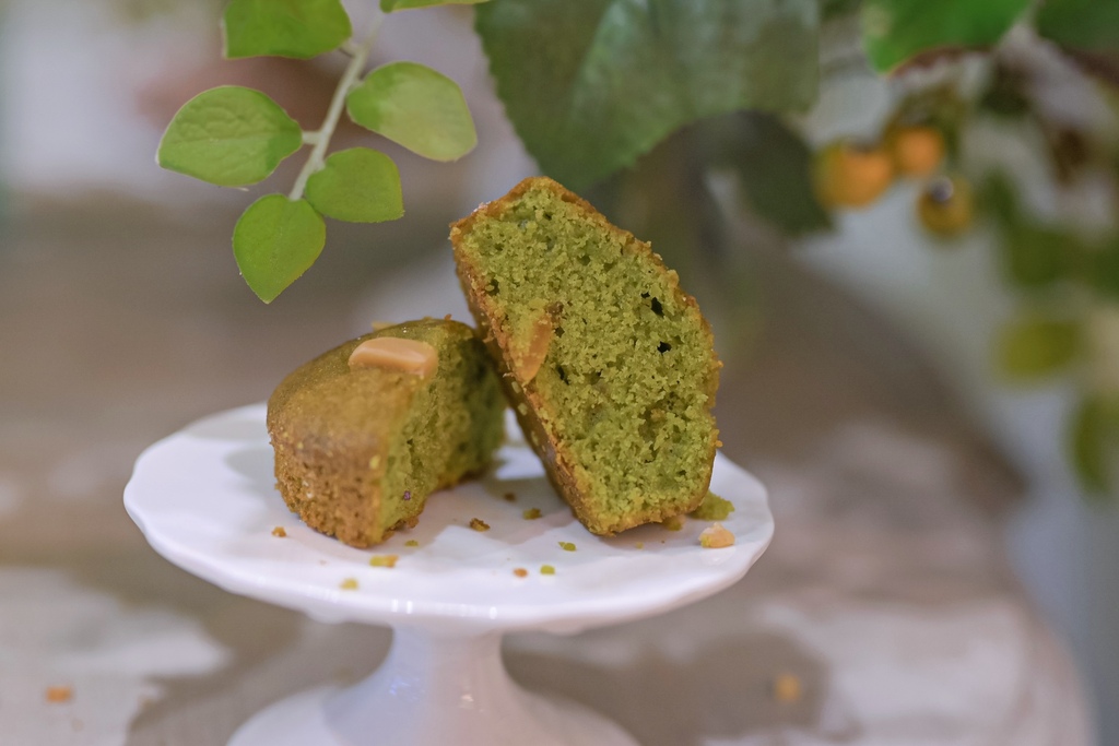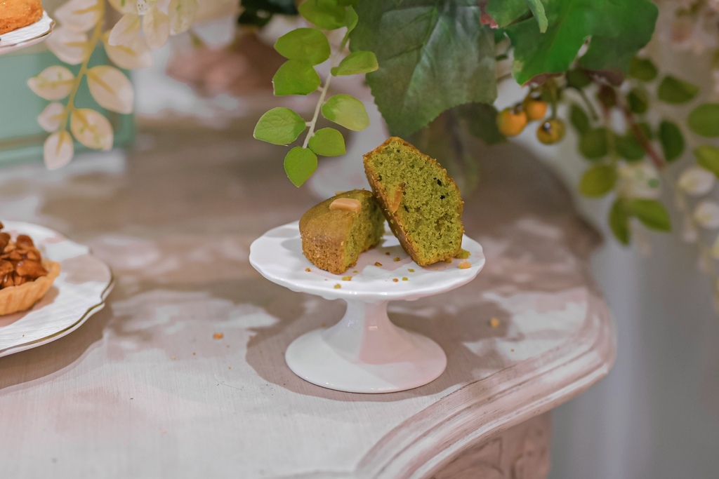 一看到一抹幽綠的抹茶蛋糕,就讓抹茶控的我印象大加分,其實不看名字及專員介紹,自已在品嚐那一刻嚐出它的風味是最驚豔的,剛入口就感受到柚子清香,尾韻抹茶味繃出,抹茶屬於淡雅細緻不澀的風味,配上有口感的杏仁條,層次感很豐富。