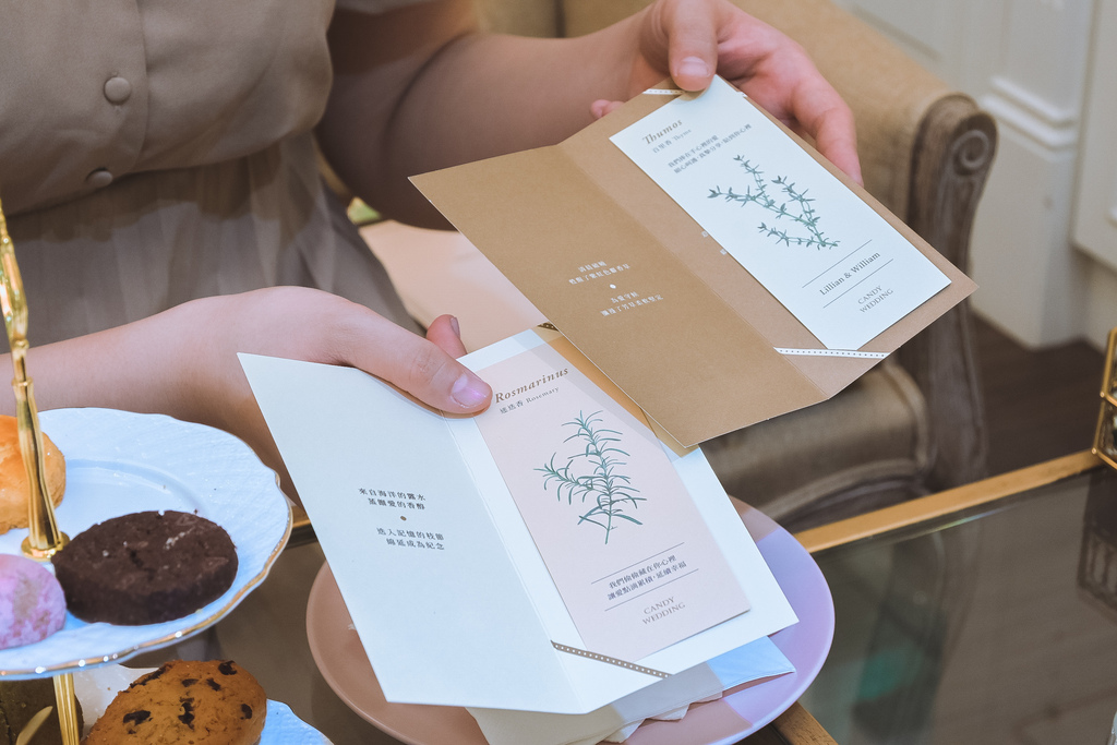 打開喜餅禮盒內會隨機附一張香草詩籤,是由新人揀選喜餅食材製作中的香草植物,可能是百里香、也可能是迷迭香,寫下新人滿滿祝福,製成紀念性的詩籤婚卡,頗具意義。