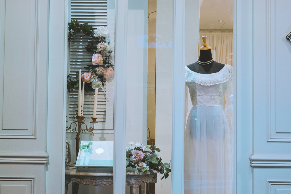 好喜歡透過玻璃窗從外往內看,婚紗服佐以花圈、花束、捧花和結婚小物等裝飾,流露出浪漫的氛圍,這次還發現禮盒除了既定湖水綠的禮盒,還多了小公主芭蕾粉色禮盒,有種甜甜的夢幻感。