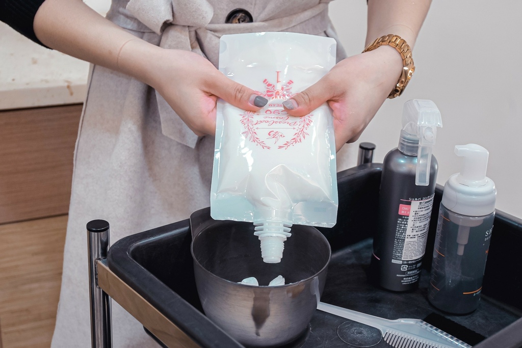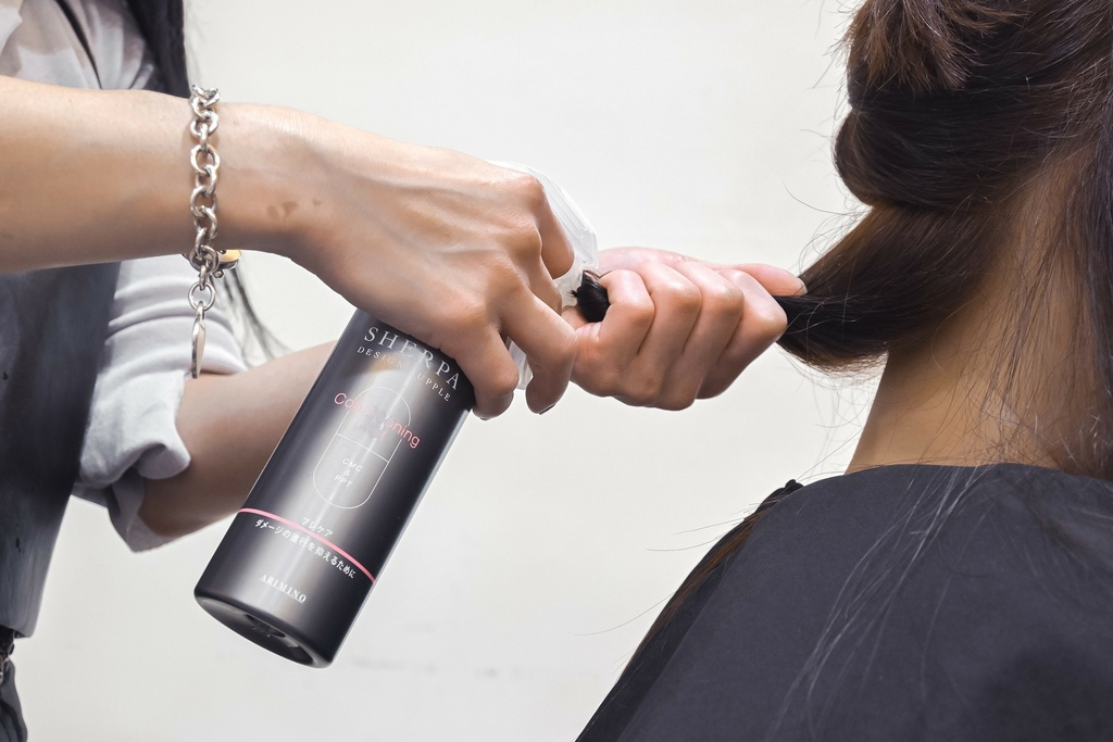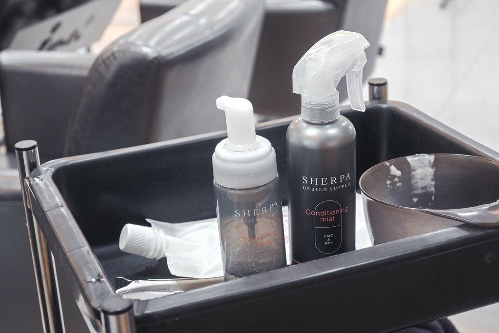 剪髮前先燙前護理使用「SHERPA雪巴噴霧」補充頭髮水分修補受損部份,使頭髮好整理。