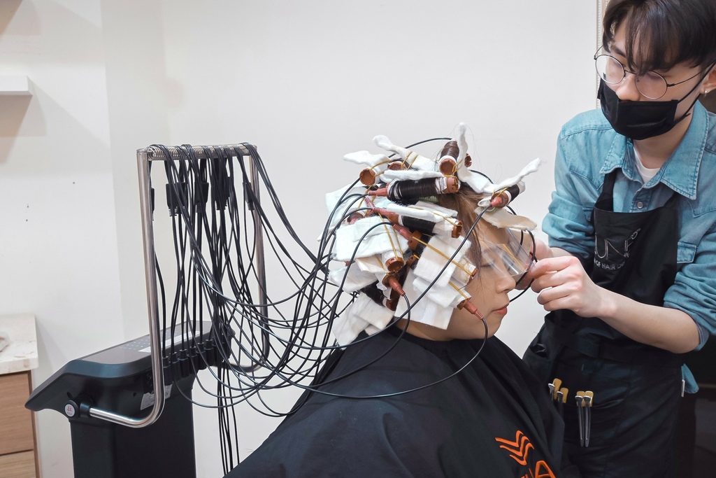 等等要溫塑燙燙捲度,溫塑燙使用高溫120度處理很傷髮質,每個髮捲都會接上電源線,慢慢加熱。所以燙前會先用雪巴調護乳打底。