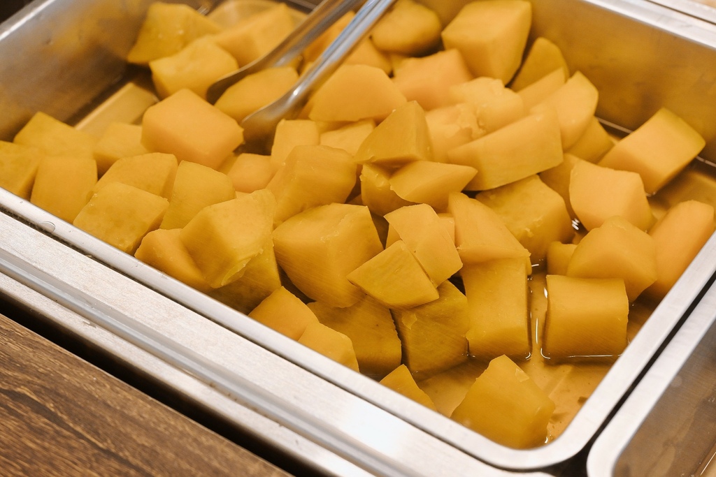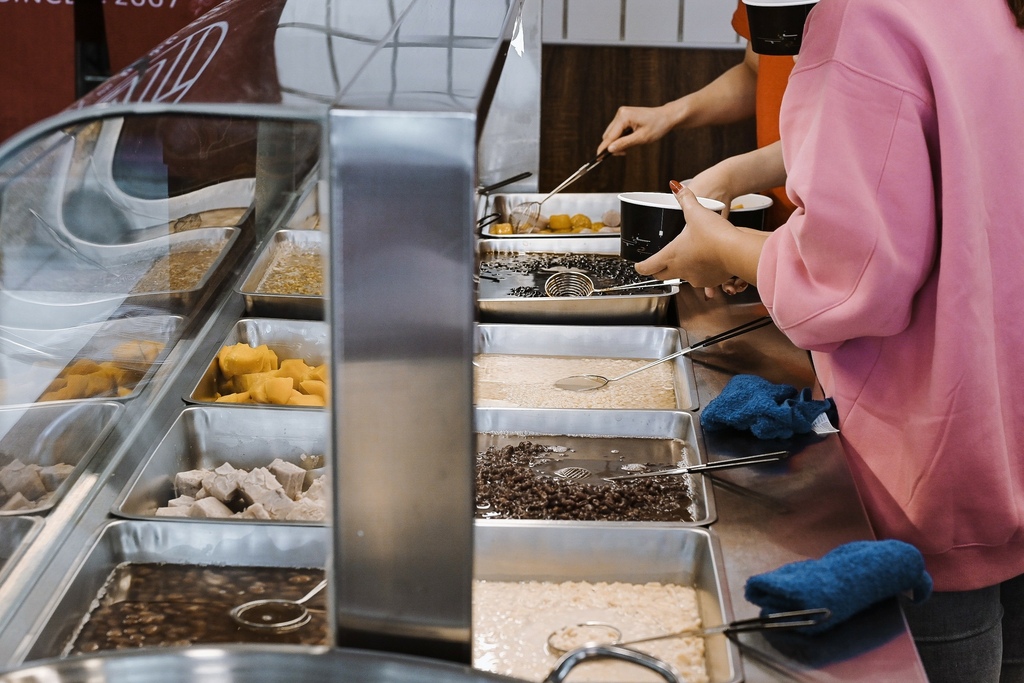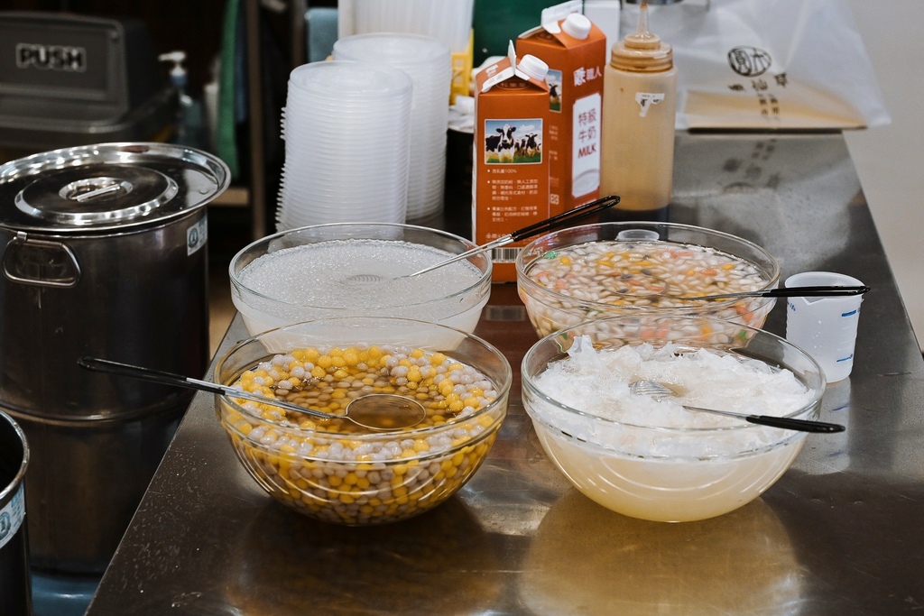 櫃台旁透明櫥櫃擺放了許多配料區像是芋頭地瓜、芋圓、地瓜圓、西米露、綠豆、薏仁、紅豆、綠豆、花生、珍珠、QQ等,每一種都是店家手工熬煮,而且不光是地瓜圓、芋頭圓那麼大顆,就連地瓜和芋頭都切超大塊。