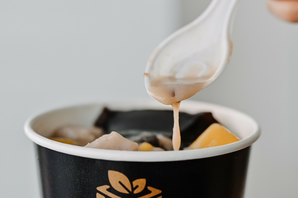 手工地瓜圓、手工芋圓size超大,一個湯匙都裝不太下,沉甸甸很有重量,咬起來也很費力,像在咬口香糖一樣很有Q勁,感覺咬上5-10分鐘都不是問題,又大顆又Q,塞滿口腔的豐富感太過癮了!