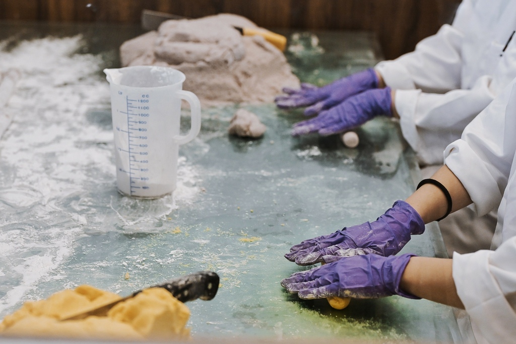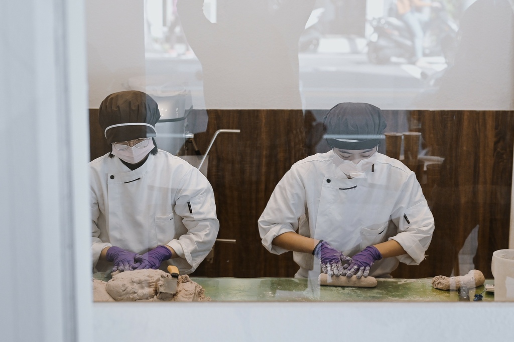 櫃台旁邊是半開放廚房,全程透明化作業,店員將揉捏好的芋圓、地瓜圓整頓切塊,一塊塊超大塊的手工地瓜圓、手工芋圓就完成了,現場製作真材實料,而且口罩手套都有包牢牢,讓人感到安心又衛生。