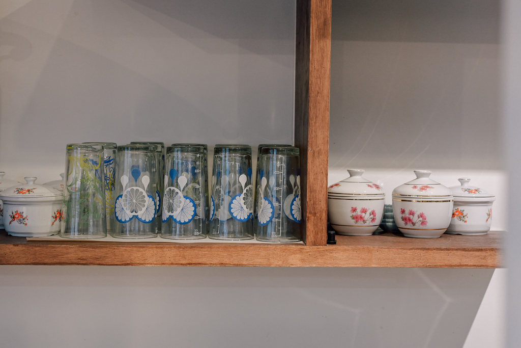 入內驚喜連連,老屋氣息濃厚,有我愛的舊花窗、藥櫃。位子頗多,當天平日去沒什麼客人,特別安靜,給我們很愜意的空間。