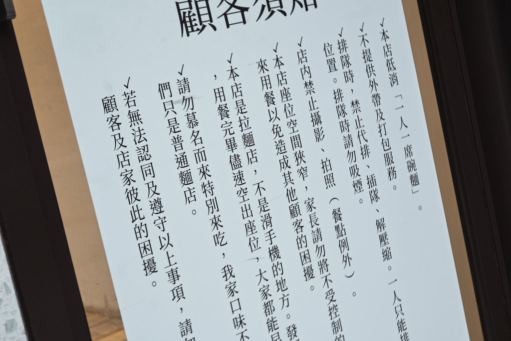 勝王需知需要大家共同遵守,內用座位僅只有九席,低消一人一碗拉麵,且最重要的一點就是店家很介意解壓縮就連麵友也是,離開隊伍就是要重新排隊,中途禁止插隊,這點我覺得非常合理。