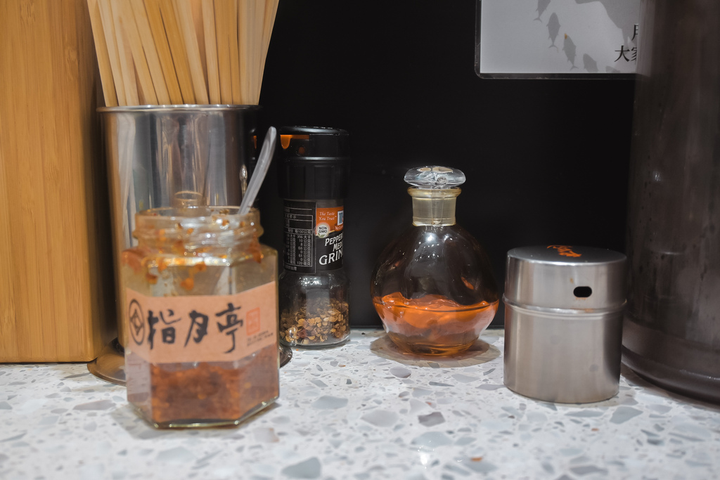 桌面上提供辛香料、七味粉等,建議在拉麵後期再加會有更多組合的驚喜風味。