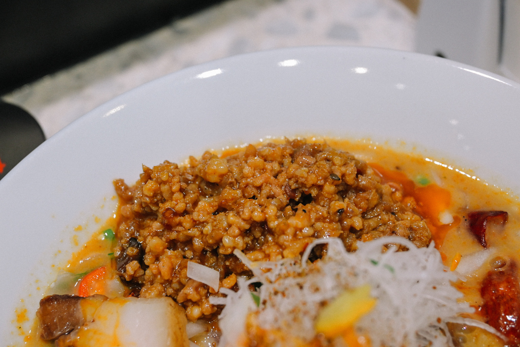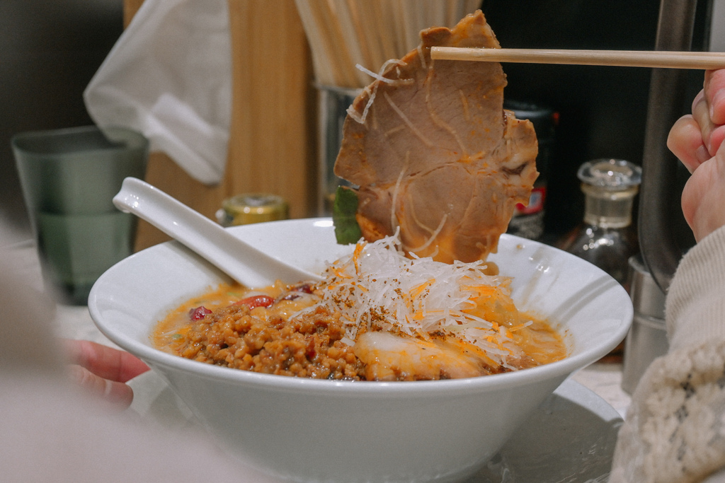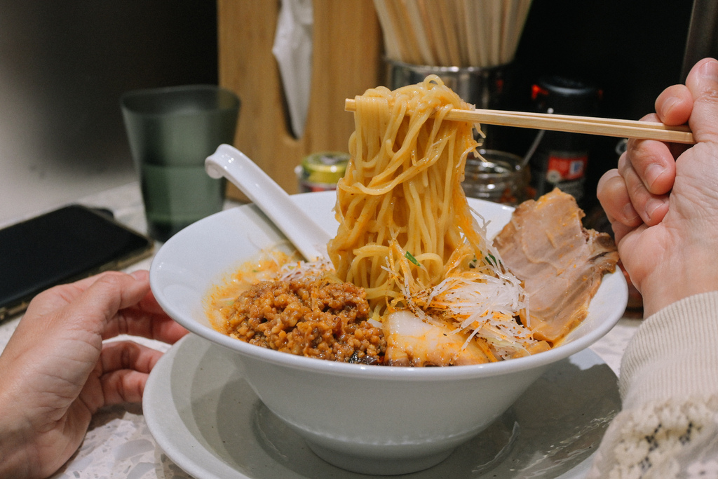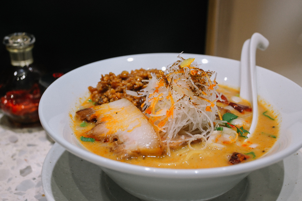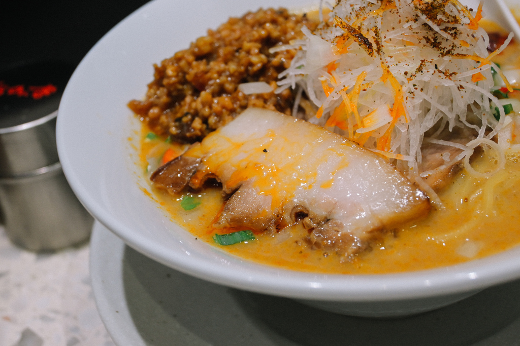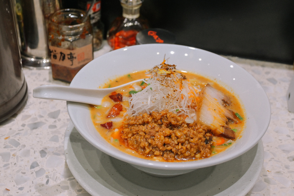 我研究了粉專每日公佈的菜單,發現以辣為主的拉麵算是少數,這一碗光看外觀及拉麵名,既定印象上是充滿日式風味又融合中國風味組合的擔擔麵,湯底紅紅火火又有辣椒的紅,想必會辣的冒火吧!