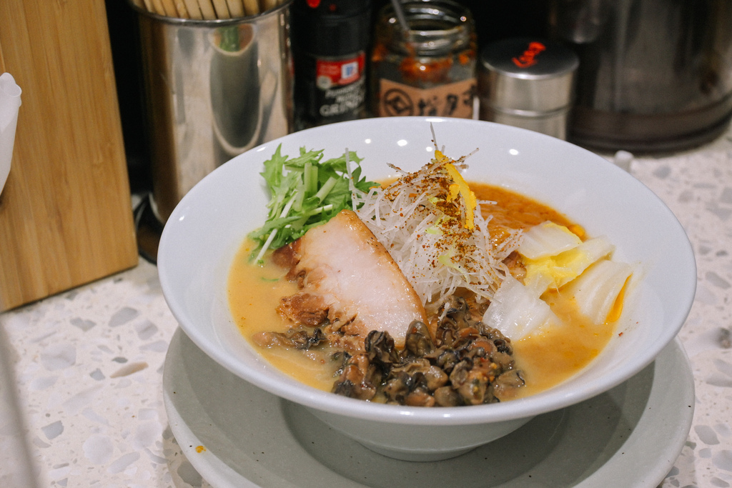 朋友點的是「八幡屋七味奶油味噌牡蠣佃煮雞白湯柳麵$350」,朋友形容是一碗充滿海味又極其濃郁的拉麵,層次感相當豐富,吃到最後也不會膩口。