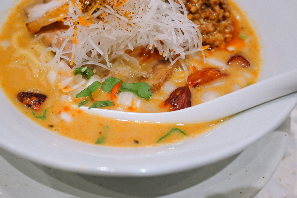 湯頭偏濃稠,多了花生醬與胡麻醬的香氣及濃郁感,伴隨山椒及柚子在舌尖稍縱即逝的麻,很解膩,喝到最後還有洋蔥給予的嗆辣感,熱的時候喝感覺都很不錯,但隨時間推移,湯頭溫度降低,顯現出缺點,會有越喝越膩的感覺。