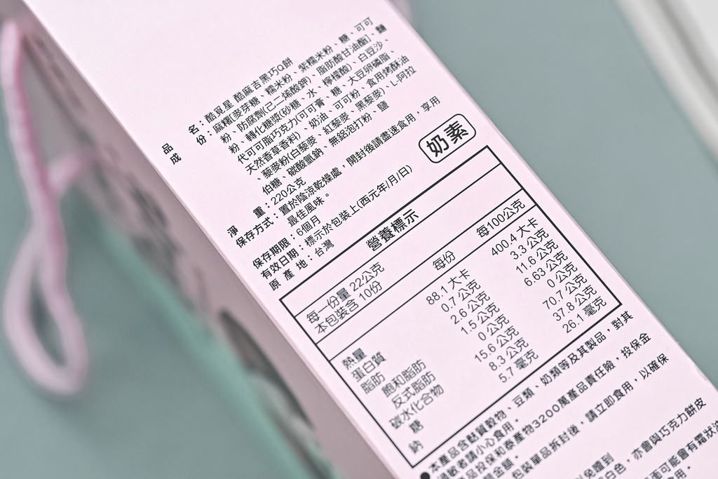 酷麻吉黑巧Q餅二側邊有詳細介紹與營養標示,沒有添加人工色素,一盒10入淨重220g,可保存6個月。