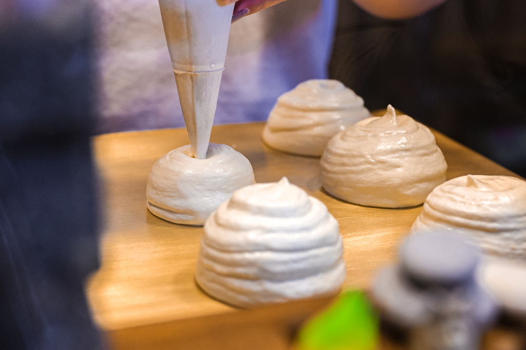 剛做好的舒芙蕾會淋上卡士達醬再撒上糖粉,就開始現場炙燒起來,看著逐漸變色型成完美焦糖色,甜甜的香氣就想立馬開吃,