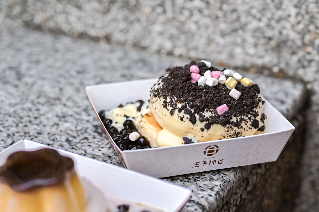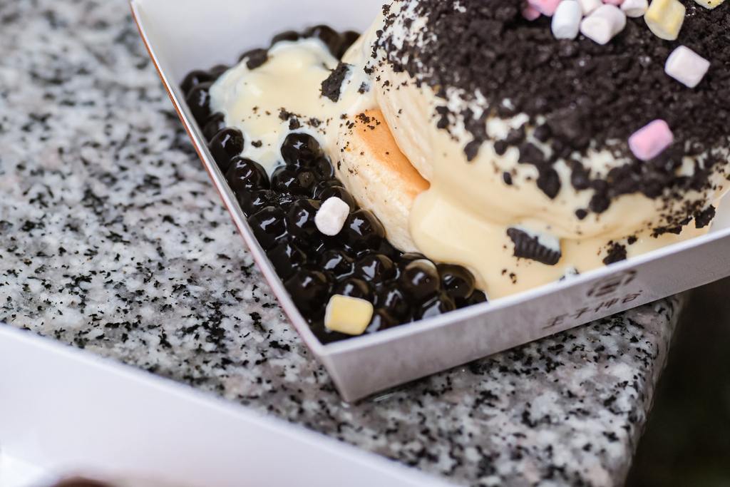 堆疊兩層的舒芙蕾,淋上香濃的卡士達醬,撒上OREO餅乾碎片與棉花糖,旁邊放上Q彈珍珠。
