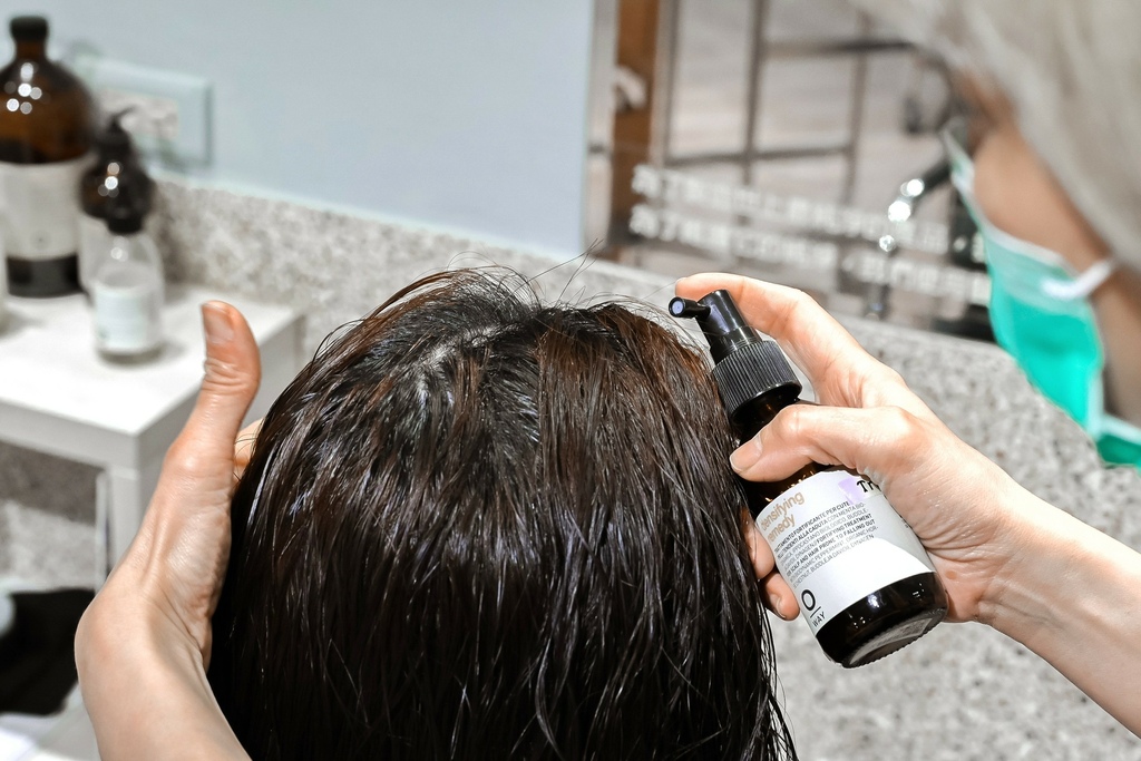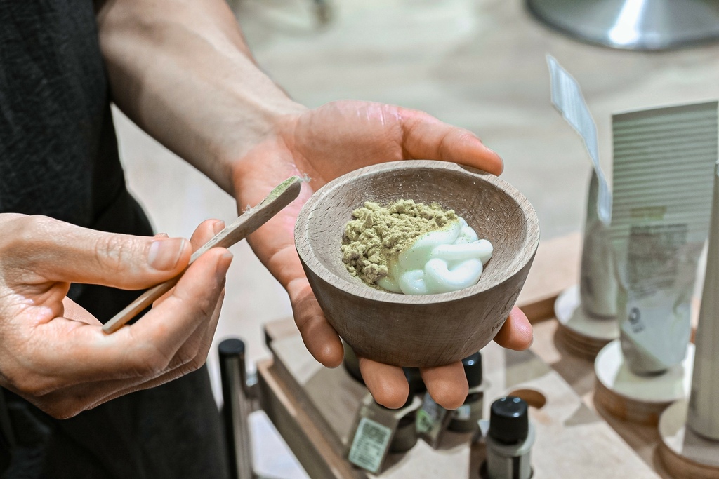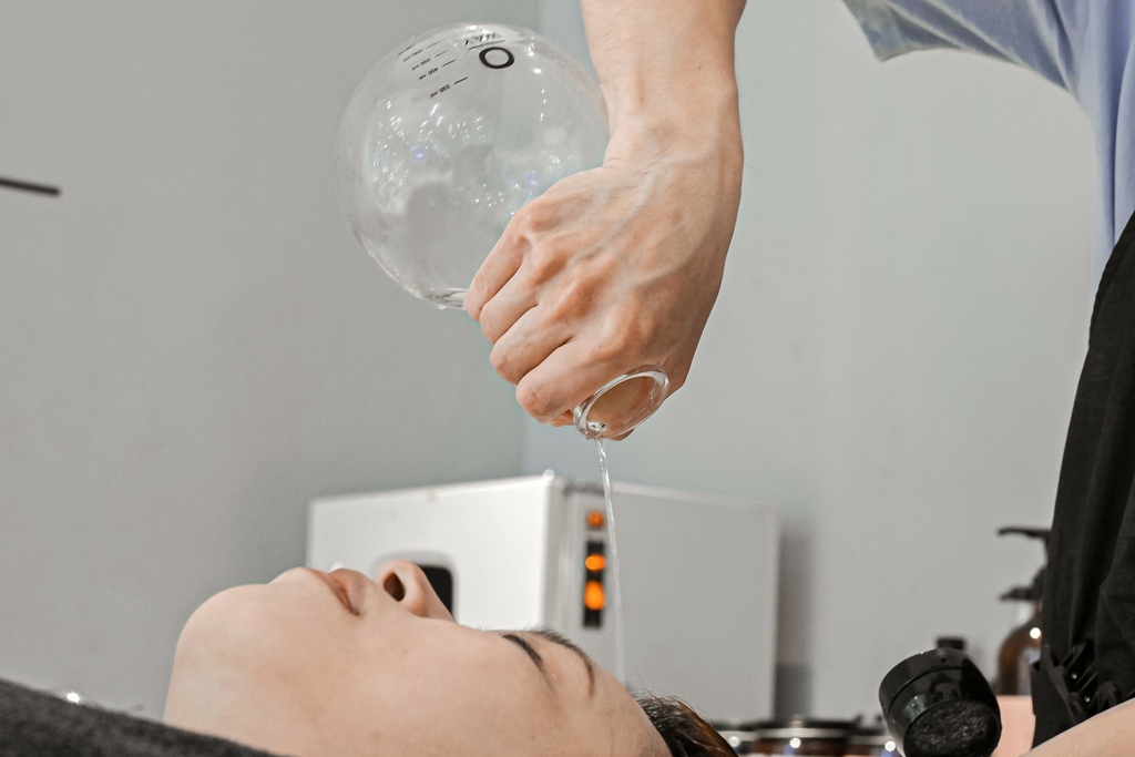 將生物動力蠟菊與米蠟強化劑兩著均勻混合後,均勻的塗在頭皮上,按摩頭皮,舒緩頭皮也幫頭皮去角質,米蠟具有神奇特性,微粒感經過手部按摩的壓力後會溶解,還會釋放角鯊烯,讓頭皮注入更多氧氣,用指腹按壓頭皮各個地方,力道由輕到重,按摩手法很舒服,我已經昏迷一半了。