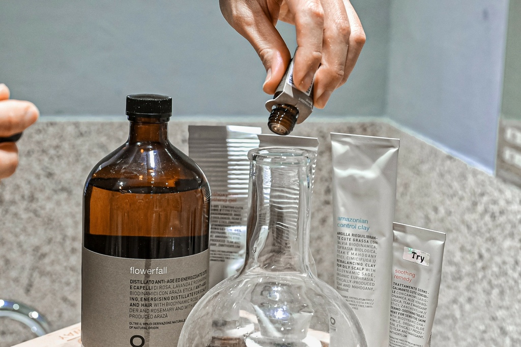 現在就要來調配我專屬的玫瑰花露配方,瓶中加入純水與生物動力玫瑰花露,再加入幾滴我選的抗氧化精油,等等就要用這玫瑰花露來洗髮,頭髮充滿玫瑰花香,光想就覺得超讚。