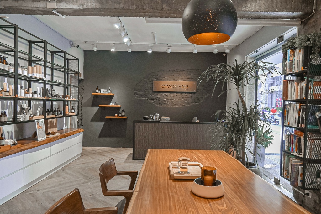 GRACE HAIR恩典創意時尚髮型店內環境很有木質感,擺設些綠色植物,空間感很舒適,讓人在自然的環境很容易放鬆。