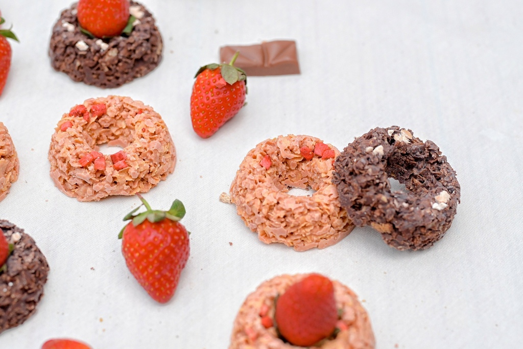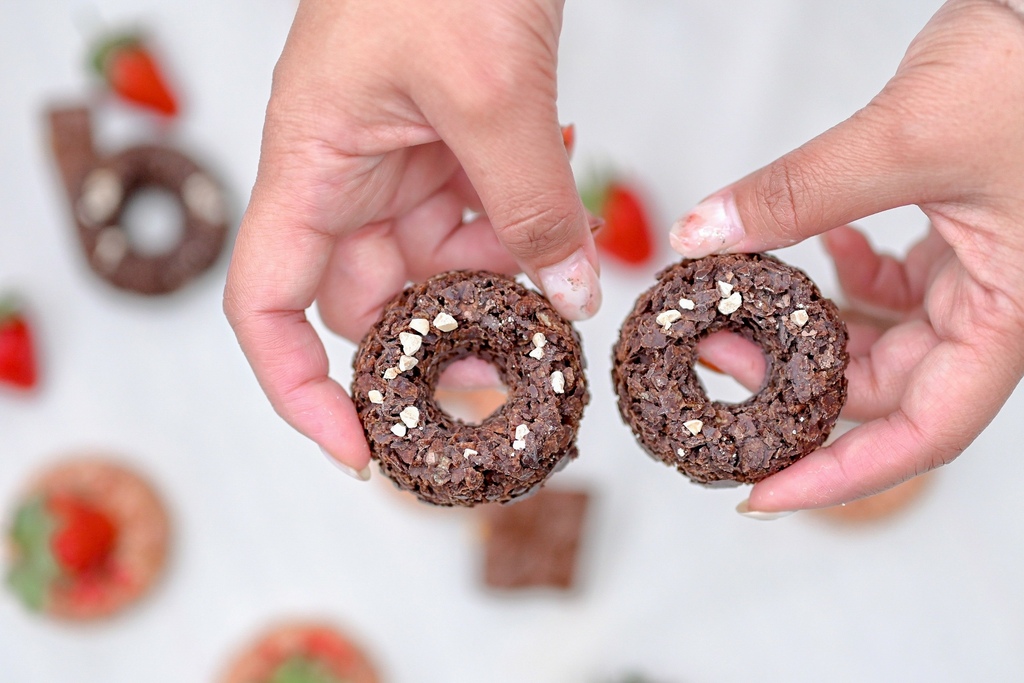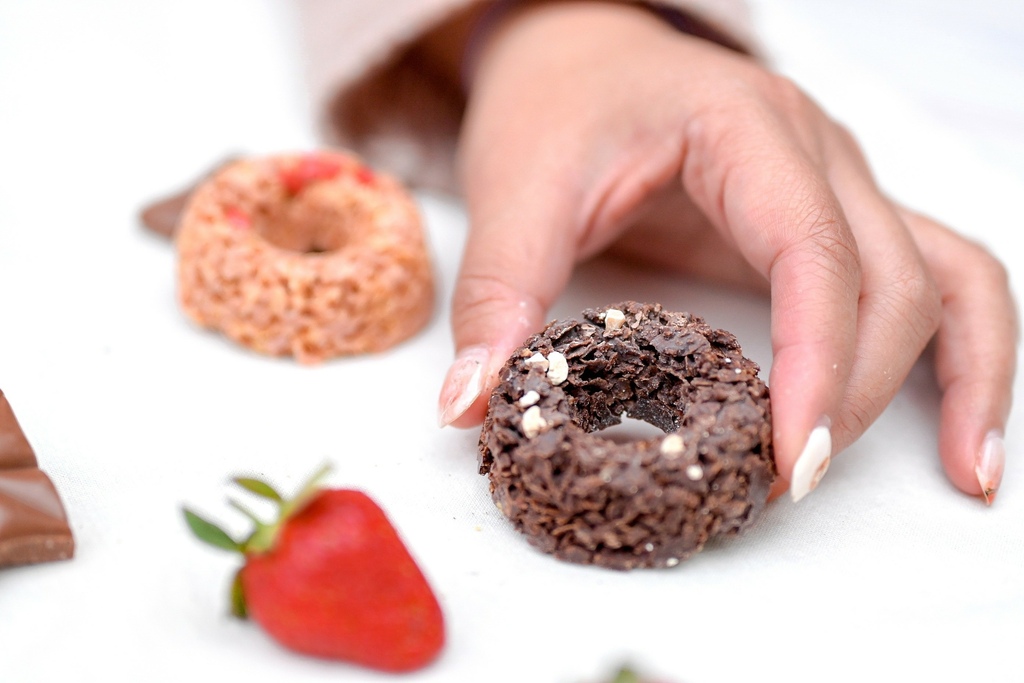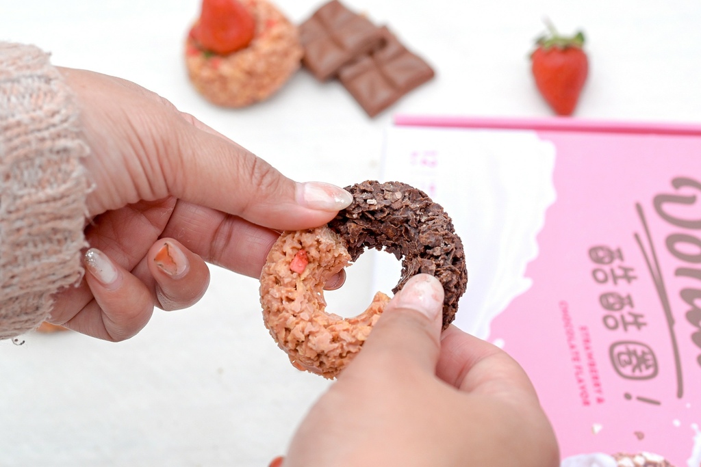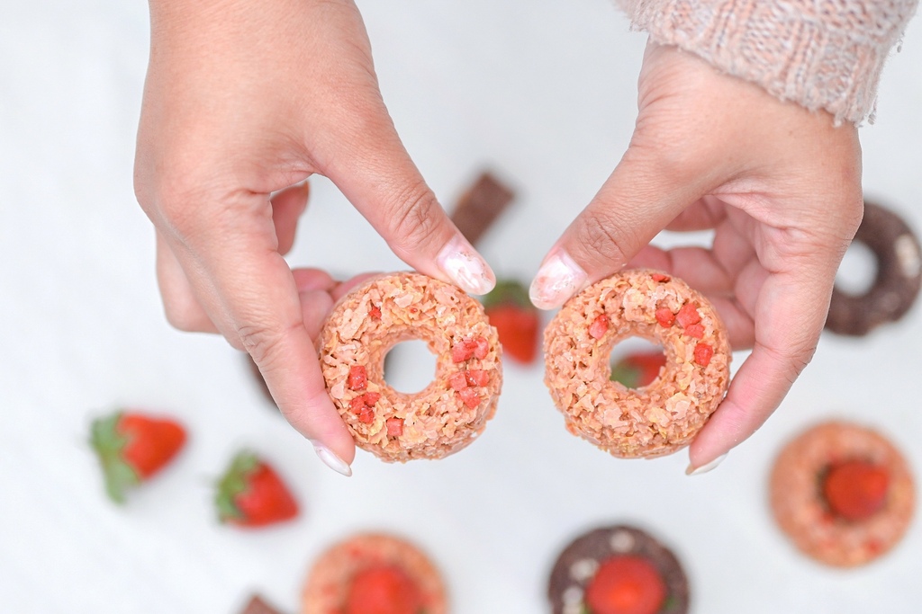 撕開透明包裝就可以看到一顆顆小巧可口的莓果脆片,像極了甜甜圈的餅乾版本,圓圓的超可愛,最主要是由酥脆玉米片組成,撒上草莓丁、藜麥粉、食用草莓香料等。