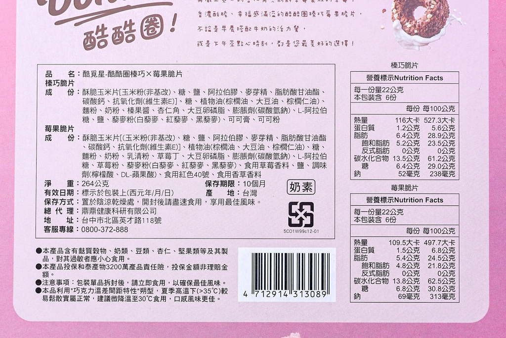 近期推出新品「酷麻吉黑巧Q餅、雙拼爆餡脆卷、酷酷圈榛巧 X 莓果脆片、酷酷包四方肉鬆蛋捲」,上回開箱完濃情蜜好麻吉的「酷麻吉黑巧Q餅」,今日開箱第二個新品「酷酷圈榛巧 X 莓果脆片」。