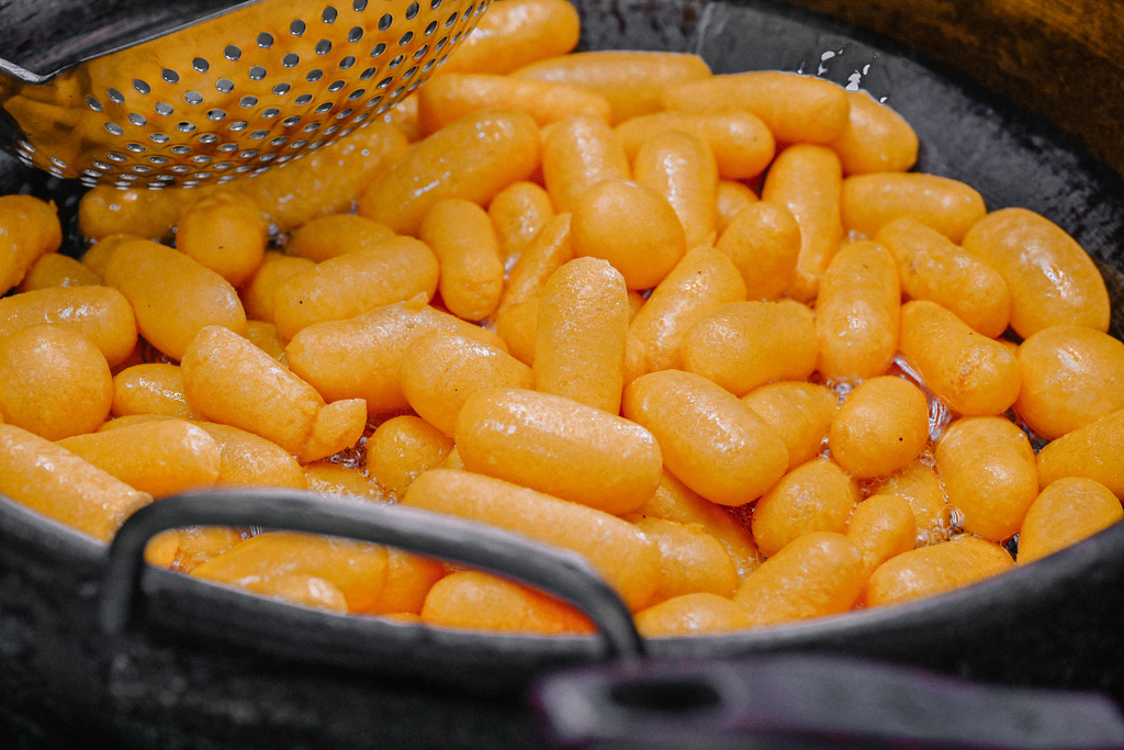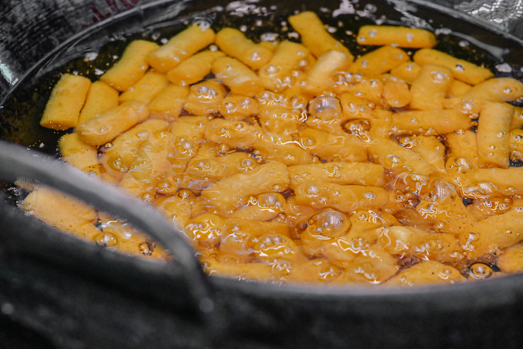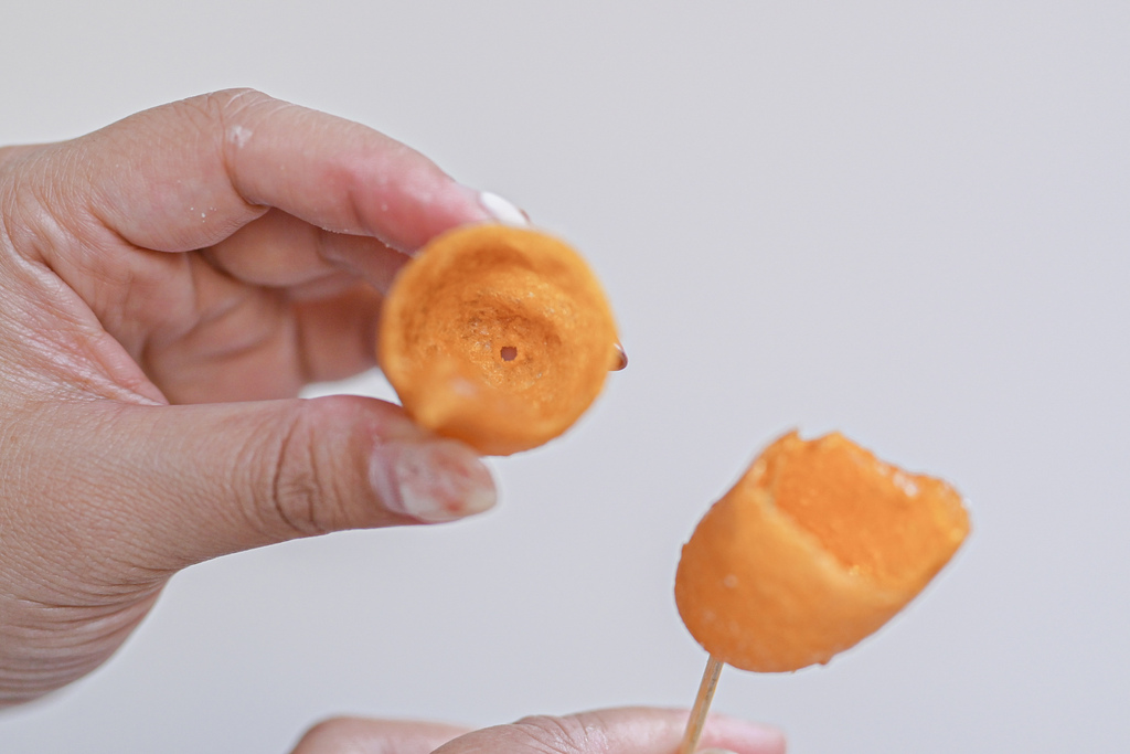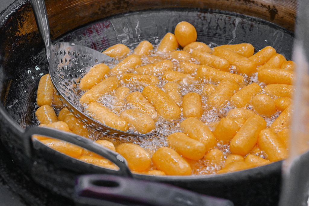 店家邊壓邊擠地瓜球慢慢膨脹,從小顆到大顆,膨脹速度驚人,畫面看起來十分療癒。手工製的地瓜球所以形狀長得和其他店家圓形不太一樣,感覺比起圓型一口一顆這樣好像會更過癮似的!?