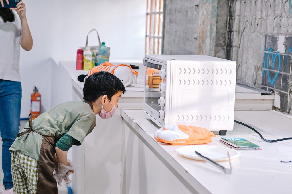 做好後的半成品放進烤箱裡等待約4分鐘後成品出爐,小朋友都好奇關心看著自己的米餅PIZZA好了沒,也太可愛,雖說我現在也是會在甜點櫃好奇看個不停啦(笑),看著起司在烤箱慢慢融化的過程也太療癒。