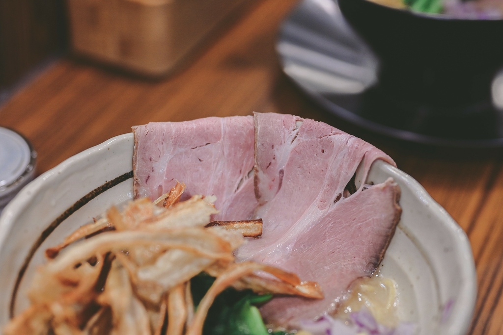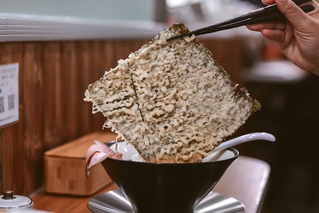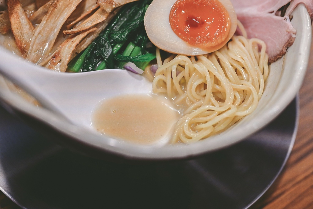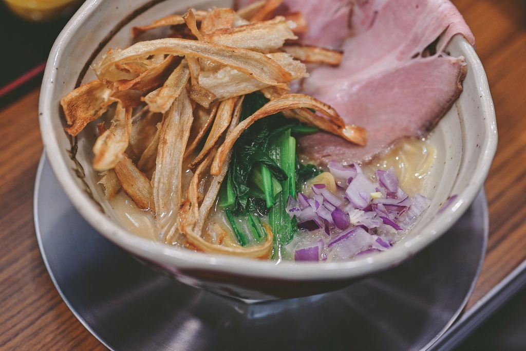 小松菜看起來很像波菜,但久放在碗中依然脆度不減,口感清脆清爽。炸牛蒡鮮甜酥脆,放在拉麵也好特別,像是放油條的感覺,一半浸潤了湯汁一半酥脆的口感,很有層次。