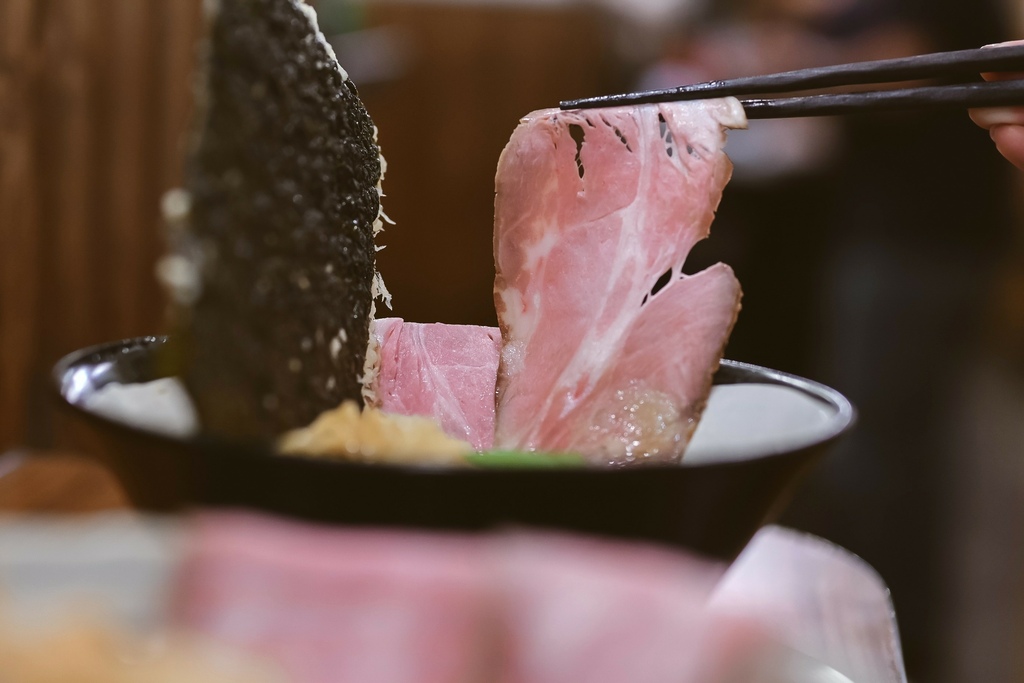 粉粉嫩嫩的主角叉燒,它的厚薄度恰好,也因使用了舒肥法,肥瘦適中非常的嫩口好咬,鹹度也不會太高,很過癮。