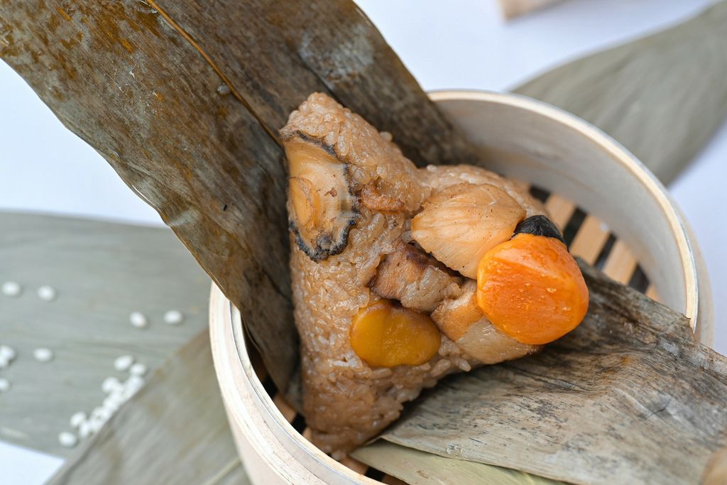 剝開粽葉一眼就能看到所有料都完美契合在米飯上,大粒的干貝與鮑魚加上五花肉、栗子、香菇、蝦米、鹹蛋黃等食材,糯米與醬油拌抄得非常均勻,每一口米飯都帶有濃濃海味,吃起來口感濕潤帶有醬油香,五花肉很肥美,干貝鮑魚很鮮美,山珍海味一次擁有,好過癮。